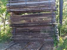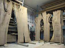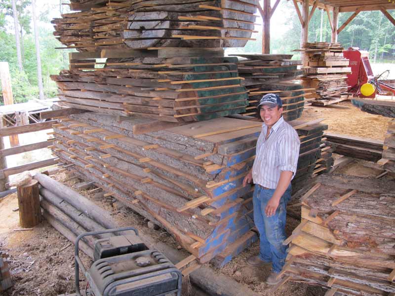 Bonfilio next to some red oak and black walnut slabs air drying in one of our barns