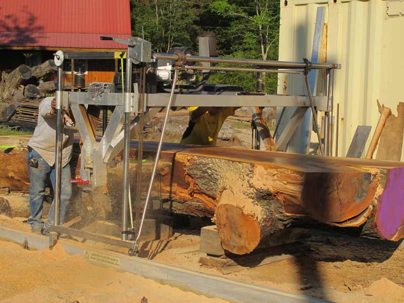 Bret and AJ milling a red oak log on the farm in 2014