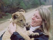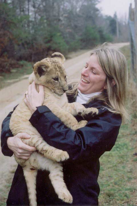 Laureen with a young lion cub after giving it a "Vet check" at a rescue organization near Durham, NC