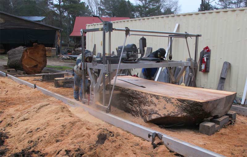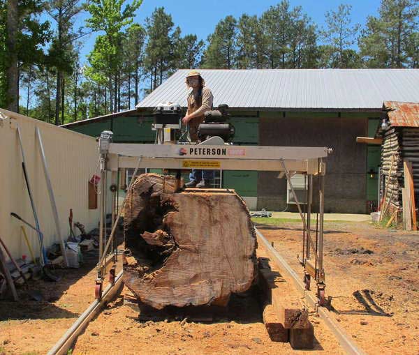 We utilize three different types of sawmills in our New Hill based operation. These include a Baker 3638D band sawmill, a Peterson 10" Winch Production Frame sawmill (also referred to as a "swing-blade" mill), and a dedicated chain slabber that was designed by Scott and built by him and Gavin Gallagher on a spare Peterson mill carriage.